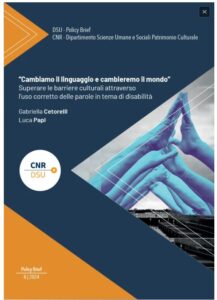 Pubblicato il 21 Ottobre 202521 Ottobre 2025 di Luca PAPI“Cambiamo il linguaggio e cambieremo il mondo” Superare le barriere culturali attraverso l’uso corretto delle parole in tema di disabilità. DSU Policy Brief 8-24. Gabriella Cetorelli; Luca Papi